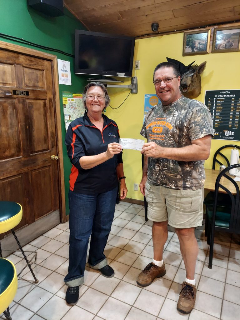 HIDDEN BEAR TRAIL (HBT) ATV CLUB DONATES TO OCONTO RIVER KIDS: The HBT ATV Club membership secretary Dawn Schomoker presents a $1000.00 check to Dan Guendert from the Oconto River Kids. The Oconto River Kids is a non-profit organization that assist children with life threatening illnesses. Their signature event is the annual bear hunt, where they take the kids out in woods to hunt a bear. The organization assist the entire family with travel, housing in the area, food, the bear hunt, processing and taxidermy if they are lucky to get a bear. The HBT Club has donated to this organization over the past 7 years and want to thank the Oconto River Kids on such a unique way to give back to the community.